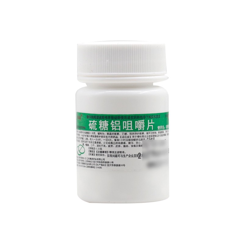 本品每片含硫糖铝0.25克。辅料为淀粉、硬脂酸镁。